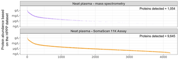 Figure 1. The SomaScan 11K Assay measures proteins across the full dynamic range of the plasma proteome. Comparison of proteins detected in neat plasma by mass spectrometry (purple) or the SomaScan 11K Assay (orange). Only proteins that overlap with the Human Plasma Proteome Project (HPPP) dataset are shown3. Data adapted from Beimers et al.1 and Kirsher et al.2.