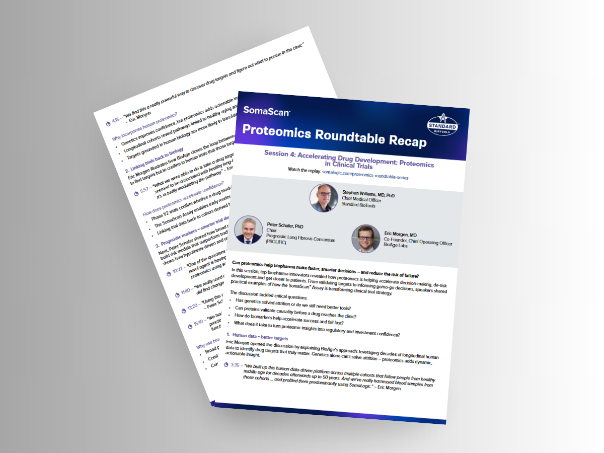 In this panel discussion, biopharma innovators share real examples of how the SomaScan™ Assay is being used to accelerate decision making, de-risk development, and bring clinical insights closer to the patient. From identifying early signals of efficacy to uncovering why a drug failed, panelists discuss how proteomic data is helping teams understand trial outcomes earlier and with greater confidence.